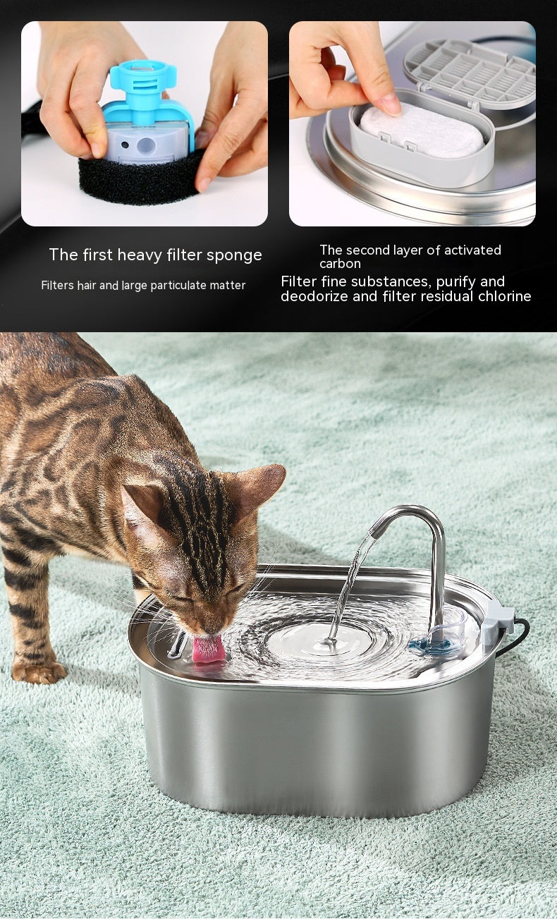 water. This 3.2L stainless steel fountain circulates, filters, and purifies—giving your pet fresh, oxygenated water that they'll actually drink more of.